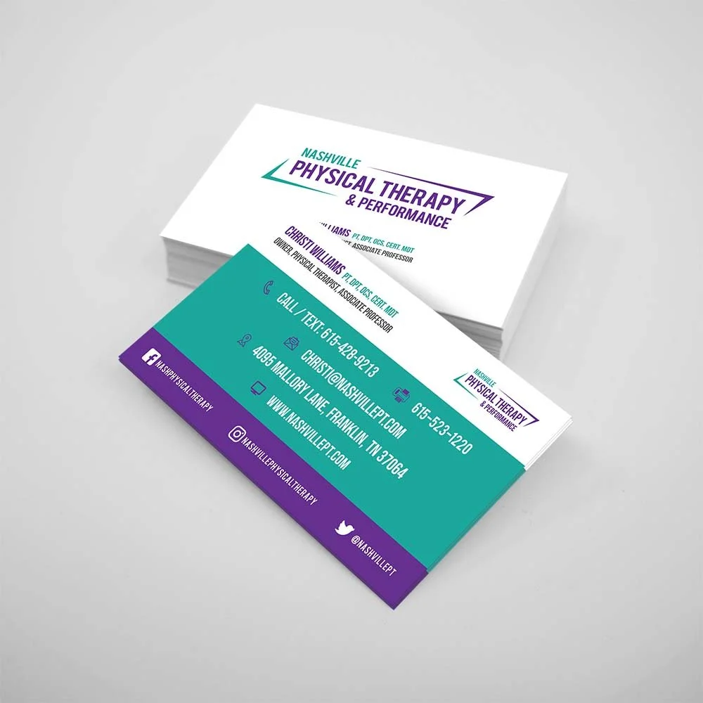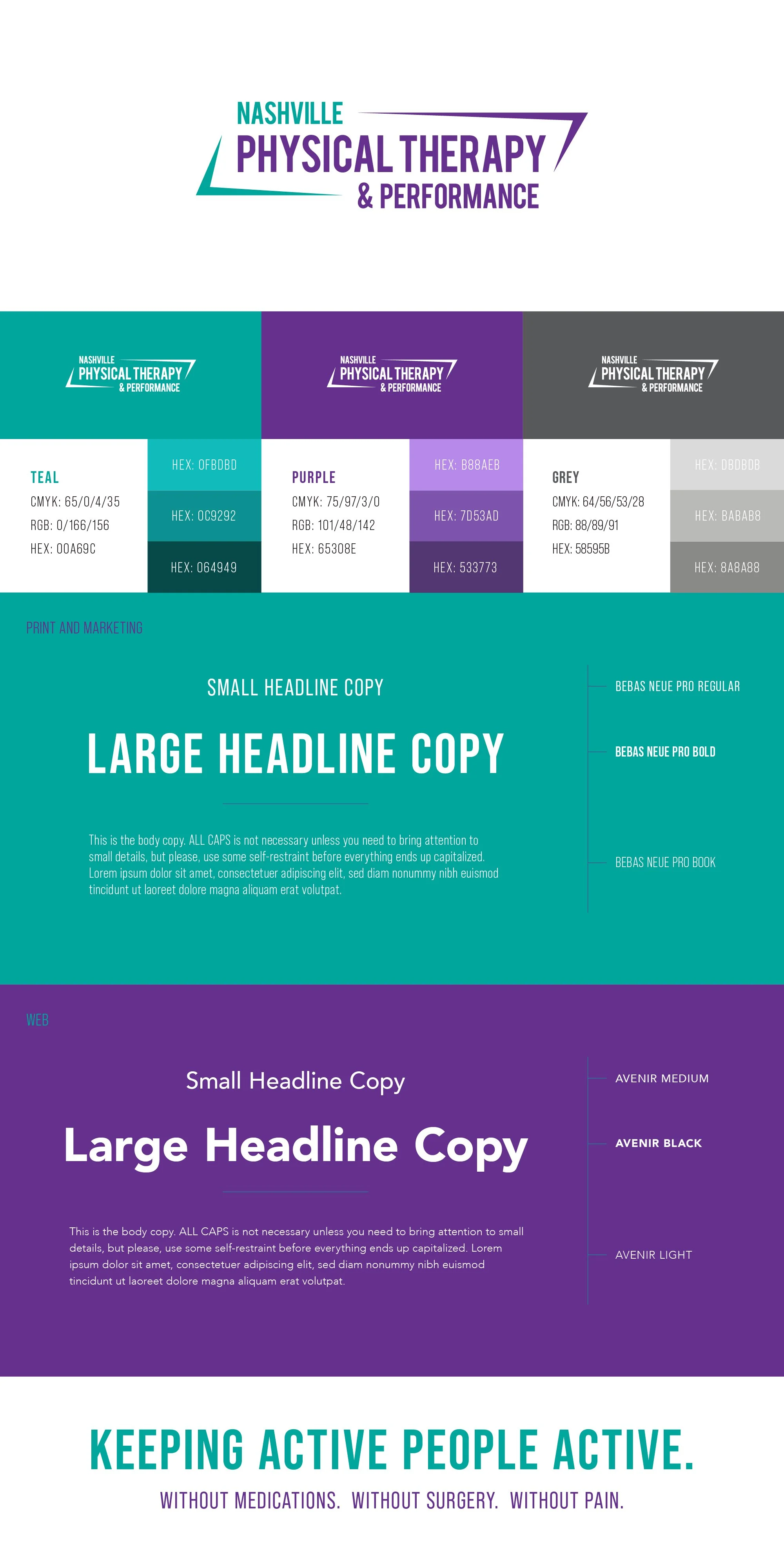 This project was built from the ground up. We started with business names that would be ideal for both quick understanding and web discoverability. Because they were located in Nashville, the name Nashville Physical Therapy and Performance was chosen. The logo was designed to resemble the state of Tennessee while also having an "active" feeling. The color purple was desired and was paired with the teal for good contrast and a relaxing yet respectable feeling.